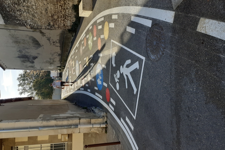 L’objectif ? Créer un véritable espace de rencontre. Grâce à des visuels explicites (vélos, piétons, familles), les automobilistes sont invités à lever le pied et à partager la chaussée avec les usagers plus vulnérables.